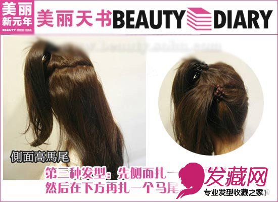 第三种发型双马尾发型。首先在侧面扎一个特高马尾,然后在下方再扎一个马尾,如上图所示。