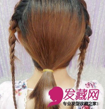 两边的头发编成简单的麻花辫,编好后的效果,如上图。