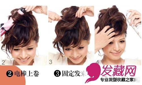 2.把散落在头顶的发束,分成小束以电棒上卷,创造带有卷度的发尾。