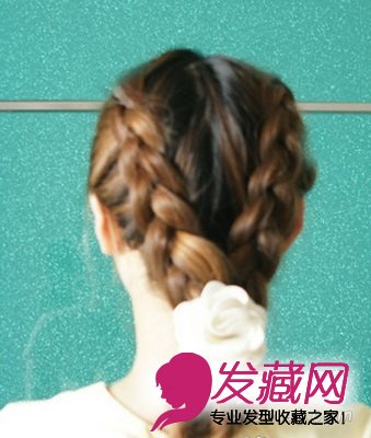 把两个辫子收在一起。用一个花朵发饰装饰一下就很漂亮了哦。