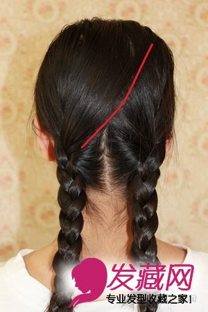 如图所示编2股麻花辫,这个步骤要注意下,在分股的时候头发要斜着分,因为要是直的分的话,编好辫子后会有一条直直的发印,很难看的。
