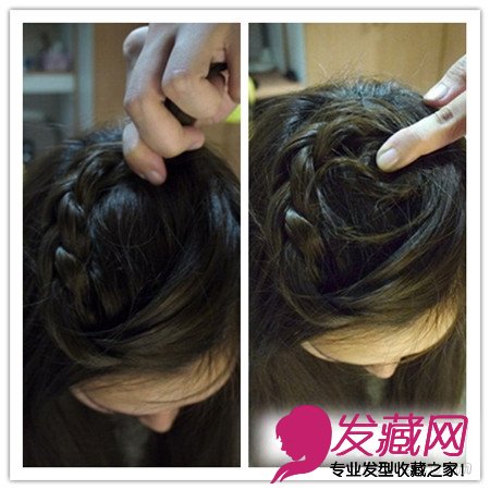 收尾,用你的食指当圆心,辫子发尾以圆心绕圆,再用小黑夹固定就ok啰!也可以喷上些许发胶会更固定啰!
