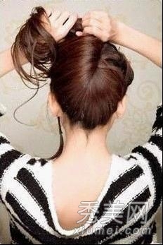 第三步,把后面的头发,一把抓起揪紧往头顶盘起,记住一定要紧,手法也要利落,如果太慢的话容易散落。