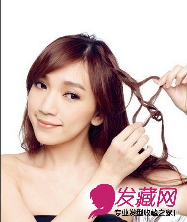 2、将刘海二八分,并在刘海分界线的左侧,取一束小长方形头发,编松散三股辫,用小发圈固定,并将三股辫以不规则的方式撕拉开。