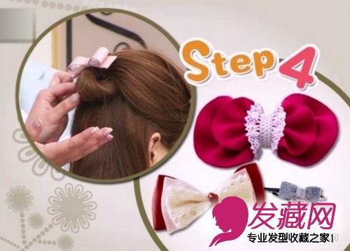 因为后脑勺的发束比较突兀,所以,可以通过小发饰来遮盖或者修饰。形成一个小发球的形状。