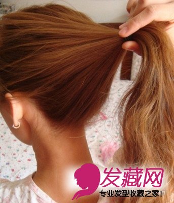 把皮筋处稍稍向后拉一下,让马尾松一些。