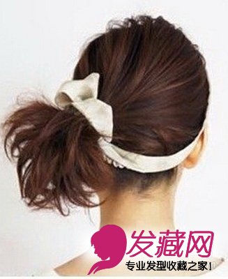 然后绑上蝴蝶结发带,注意是在橡皮筋的位置上绑上一个大的蝴蝶结。