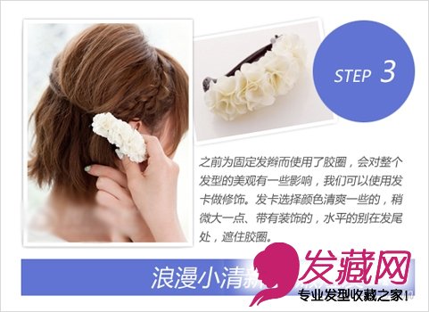 之前为固定发辫而使用了胶圈,会对整个发型的美观有一些影响,我们可以使用发卡做修饰。发卡选择颜色清爽一些的,稍微大一点、带有装饰的,水平的别在发尾处,遮住胶圈。这样不仅修饰了不足,同时也让整个造型显得更加清新、可人。