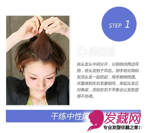 将头发从中间分开,分别梳向两边耳侧,将头发别于耳后。用手将刘海和发顶头发一起抓起,用手稍做梳理。尽量做到左右发量相同,束起头发正对鼻梁,否则左右不平衡会让发型显得不协调。