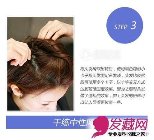 将头发稍作扭转后,使用黑色隐形小卡子将头发固定在发顶,头发比较松散可使用多个卡子,以十字交叉方式达到较佳固定效果。因为之前对头发做了蓬松的效果,加上头发的扭转可以让人显得更拔高一些。