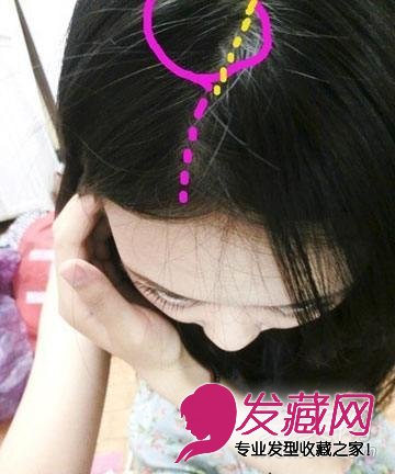 看到红色线和黄色线了吗?红色是刘海的分线,黄色是后面头发的分线。现在把后边长的头发向刘海偏的那边梳过去,也就是把红色和黄色分在一条线上。
