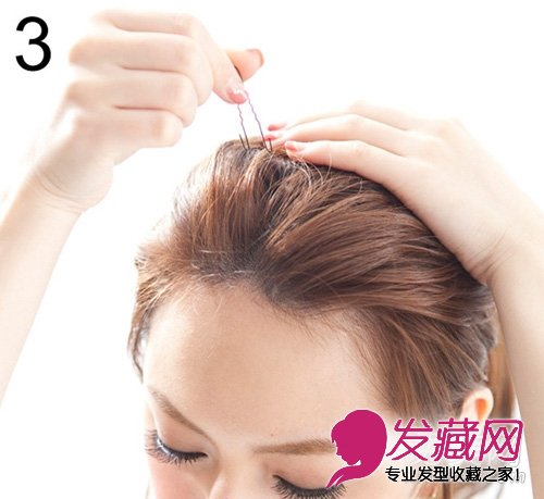 用五指代替梳子将刘海整个向后梳,再以U型夹插入固定即可。