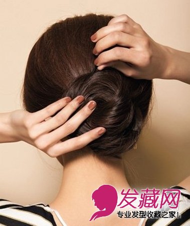 挽发髻的时候在手上均匀抹上定型啫喱,一边挽一边帮助定型,造型后用黑色发卡别上,喷上防毛躁发胶。