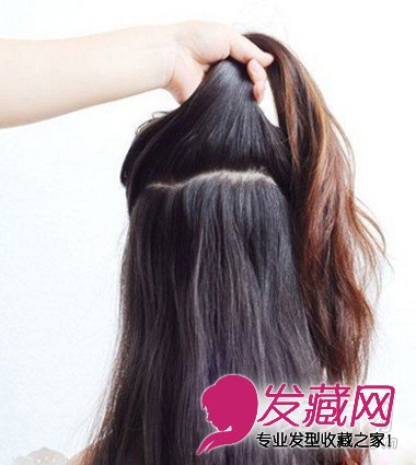 步骤一:先将长发披散下来,再如图所示把头发分成上下两个区域,用手抓好上区域的头发。