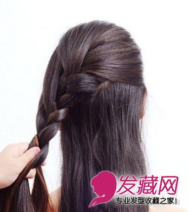 步骤三:编好两小节后,再按照蜈蚣辫的编法从左侧不断加入头发,继续编至发尾处。