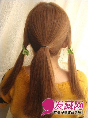 步骤2、左右两侧的头发用夹子分区夹好。将中间这区较多的头发用皮筋扎起。