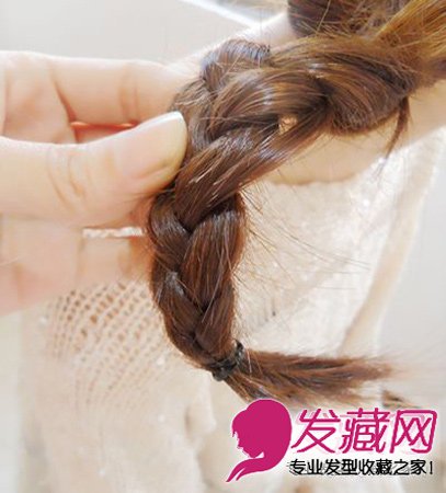 编到没有头发加后,再按麻花辫的编法编完剩余的,用皮筋固定。