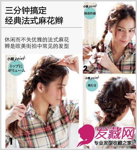 1、将所有头发从中分为两等分,抽取两股细小发丝保留至前额。分别从头顶开始,向耳侧编织成三股辫,并用手适当拉扯头顶发丝,保持稍显凌乱的蓬松感。