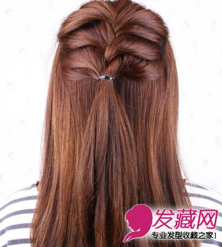 首先,取上面一层头发,编成加股辫。再重复一下如何编加股辫:按普通麻花辫的方法编一次,然后再取一股续编上次三股其中的一股合成一股,始终保持三股头发,按此类推,不断按三股先后顺序续接地编。