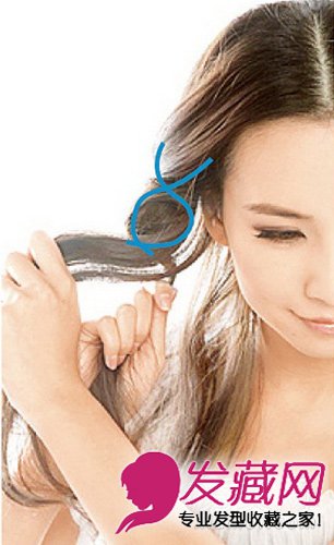 右边头发用扁梳逆梳刮蓬。取靠近发际线一束发丝,分两股,松转一次后,再边转边加入后方头发,编至中段用橡皮筋固定。左边重复相同动作。