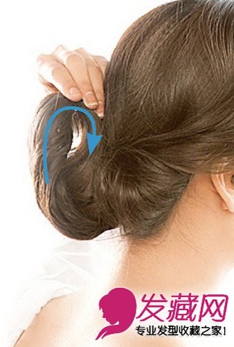 发束往上往内收成一个卷度,动作4橡皮筋藏于发卷内,用小黑夹定于后脑勺。这样就完成啦。