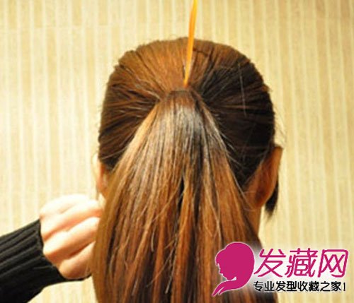 然后,用美发工具专门穿头发的,如图所示把它插在皮筋处