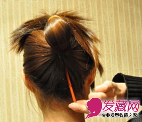 接着,整个穿过来(如果没有这个工具,也可以在皮筋处挖一个洞,然后把马尾整个穿过来)