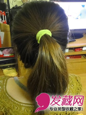 首先,扎一个不高不低的马尾辫发型。注意位置偏向右