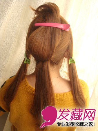 首先,把头发分为4部分。分别是左右2个部分用夹子夹起,然后在后面扎一个低马尾。再把马尾分成2部分,上面夹起的部分留多一些。如图所示。