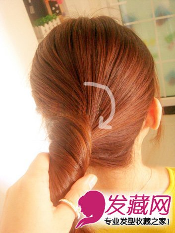 整条马尾从发根处,从左至右的旋扭一圈,如图示。