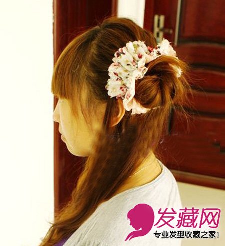 第六步:在丸子造型上套上一个可爱的碎花发圈,既美观又能固定丸子。