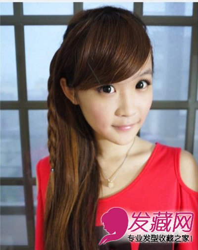整体效果图。这款侧披发型搭配向一侧完全倾斜的刘海显得时尚又可爱,编好的麻花辫与执法相互融合尽显出女生的甜美气质。