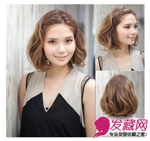 发型点评:刘海编发以其甜美精致的风格受到越来越多的MM喜欢,这款短发梨花头将刘海全部编起来,清爽简单,卷发发丝缠绕在脸颊两侧,展现出女生的柔美感。