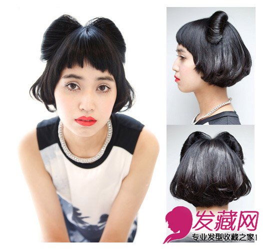 发型点评:猫耳扎发延续2013年的流行趋势,到了2015年继续火热。黑色短发剪除眉上碎发刘海,提升脸部的清爽程度,两只猫耳扎发可爱俏皮,一抹红唇让你瞬显性感火辣。