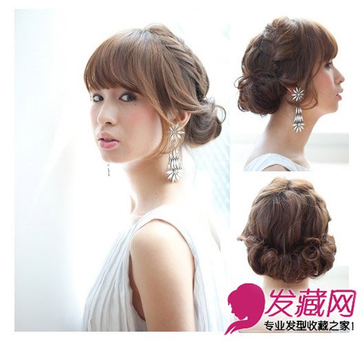 发型点评:棕色齐刘海减龄修颜,饱满的盘发设计尽显优雅高贵,这款发型出席酒会最显衬托你的优雅气质。