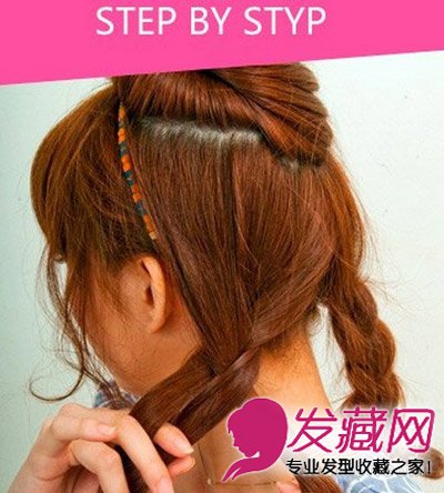 4、再把全部头发区分上下两部分,把下部分头发再分两小部分,然后把发带加进头发中进行编织宽松的麻花辫形状。