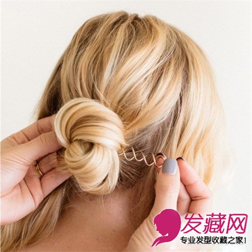 STEP 2 把刚刚那个步骤扎好的马尾辫逆时针沿着橡皮筋向上旋转缠绕盘成一个简单的盘发,最后用螺旋夹子固定盘好成型。