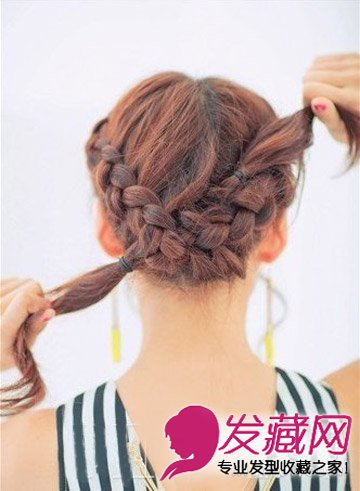步骤三、将两条发辫在后枕骨位置进行打结交叉。