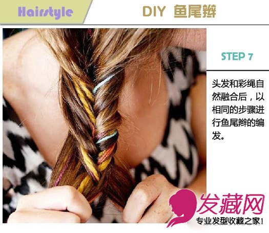 Step7:头发和彩绳自然融合后,以相同的步骤进行鱼尾辫的编发。