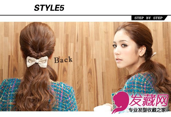 内扣马尾相比传统的马尾更显别致甜美,一只蝴蝶结发饰点缀在脑后,浪漫吸睛。