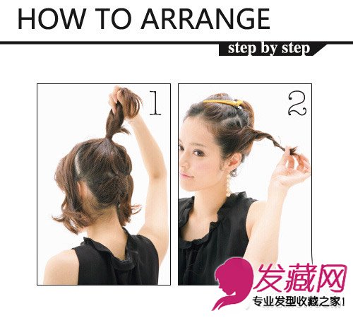 step 2:将中分的头发分成上下两部分,扭转与马尾固定在一起。