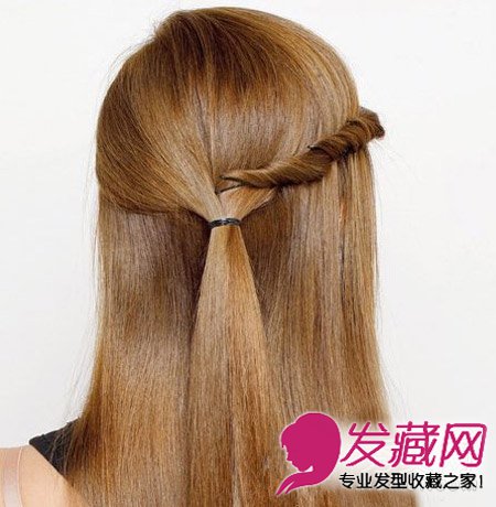 3、然后与左侧刘海在脑后相会,用皮筋固定。