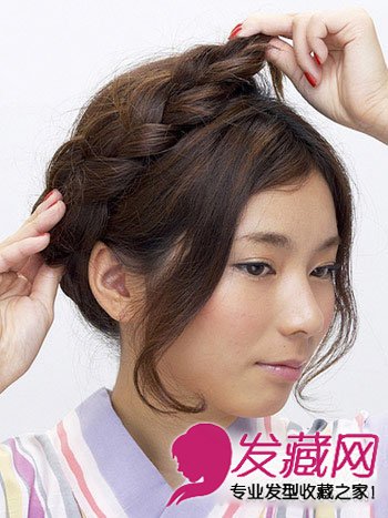 step4:拉住发尾将发辫沿着头顶缠绕。
