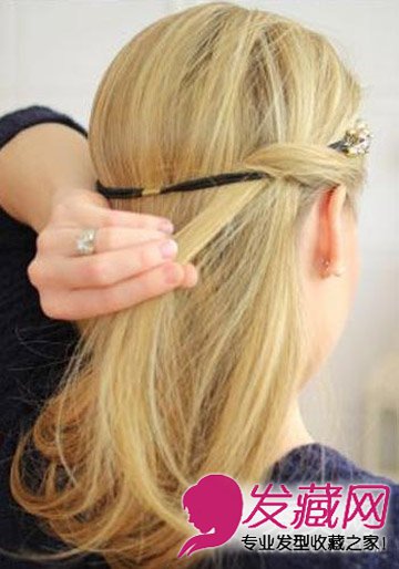 2、选取一缕头发,从右侧提取之穿过发带,然后再缠绕一次发带。