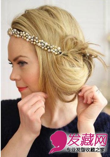 7、拉松一些发圈上的的头发,形成不对称的发感,并遮盖住左耳。