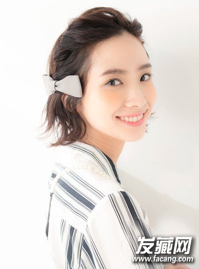 前额的刘海与右侧的头发一起扭转成别致的发辫,蝴蝶结发夹的修饰下尽显甜美感。