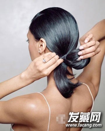 step 2:在脖颈处按照低马尾的梳发将头发全部梳好,再绑头发的时候不要把头发完全拽出,留一部分发尾,并且做出一个发髻。