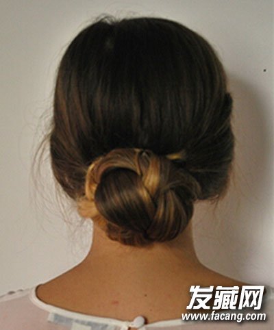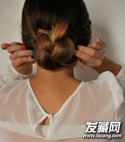 复古盘发教程STEP8 最后剩下的发尾用发夹固定在发髻内侧,如果发髻松动可用发夹固定好。