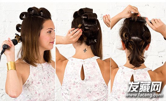 step1:如图,用卷发棒将中间部分的头发烫卷,并用鸭嘴夹保持固定冷却。