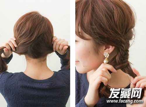 step3:分好之后,在耳朵后面开始将头发编成鱼骨辫。另一边也一样。